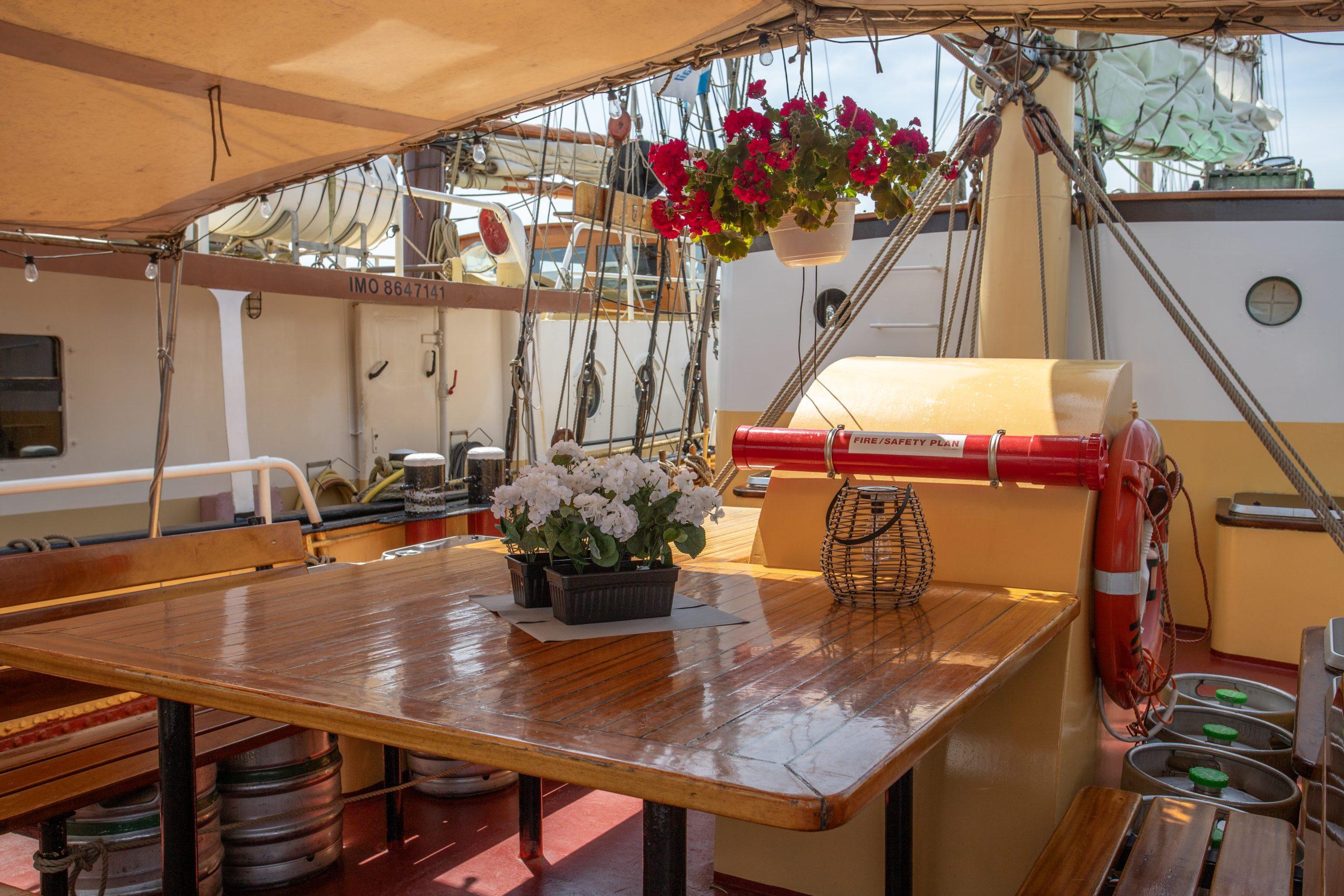 Our traditional tall ships all have a large outdoor area with seating and a cozy day room. Of course, sanitary facilities are also available. The service on board will take care of your drinks requirements. Snacks and snacks are also available on board.